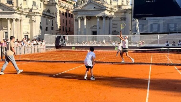 Un pomeriggio speciale per tanti bambini romani che, in una delle piazze più famose della città, si sono ritrovati a giocare a tennis con Matteo Berrettini. Il tennista ha trasformato piazza del Popolo in un campo da gioco a cielo aperto, invitando giovanissimi fan a scendere in campo con lui. Alcuni sono stati scelti dal pubblico: «Tu, vieni a giocare con me», ha detto Berrettini sorridendo a un bambino con la racchetta in mano. I più piccoli, emozionati, hanno afferrato la racchetta, battuto il cinque con il campione e provato a scambiare qualche colpo con lui.