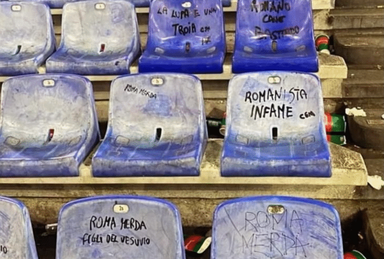 Durante la finale di Coppa Italia tra Bologna e Milan, disputata mercoledì sera allo stadio Olimpico, i tifosi milanisti— sistemati eccezionalmente nel settore Curva Sud, casa storica del tifo romanista — hanno lasciato un segno indegno: numerosi seggiolini vandalizzati, con scritte offensive come “Romanista infame” e “Roma m***”, tracciate con bombolette spray, e danni provocati da fumogeni e materiali pirotecnici. Alcuni sedili sono stati addirittura bruciati.