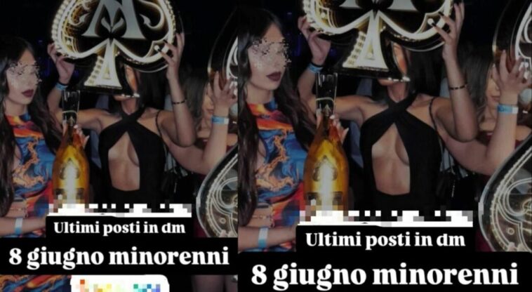 Su Instagram circola una prevendita per una festa fissata per l’8 giugno in una discoteca di Roma nord, evento dedicato esclusivamente a ragazzi tra i 13 e i 17 anni. Le immagini promozionali mostrano tre ragazzine in abiti succinti, con una bottiglia magnum di champagne in mano e pose provocanti. Il contenuto, diretto anche a studenti delle scuole medie, include scritte come “serata minorenni”, ma il tono richiama ambienti e messaggi lontani da un contesto pensato per adolescenti.