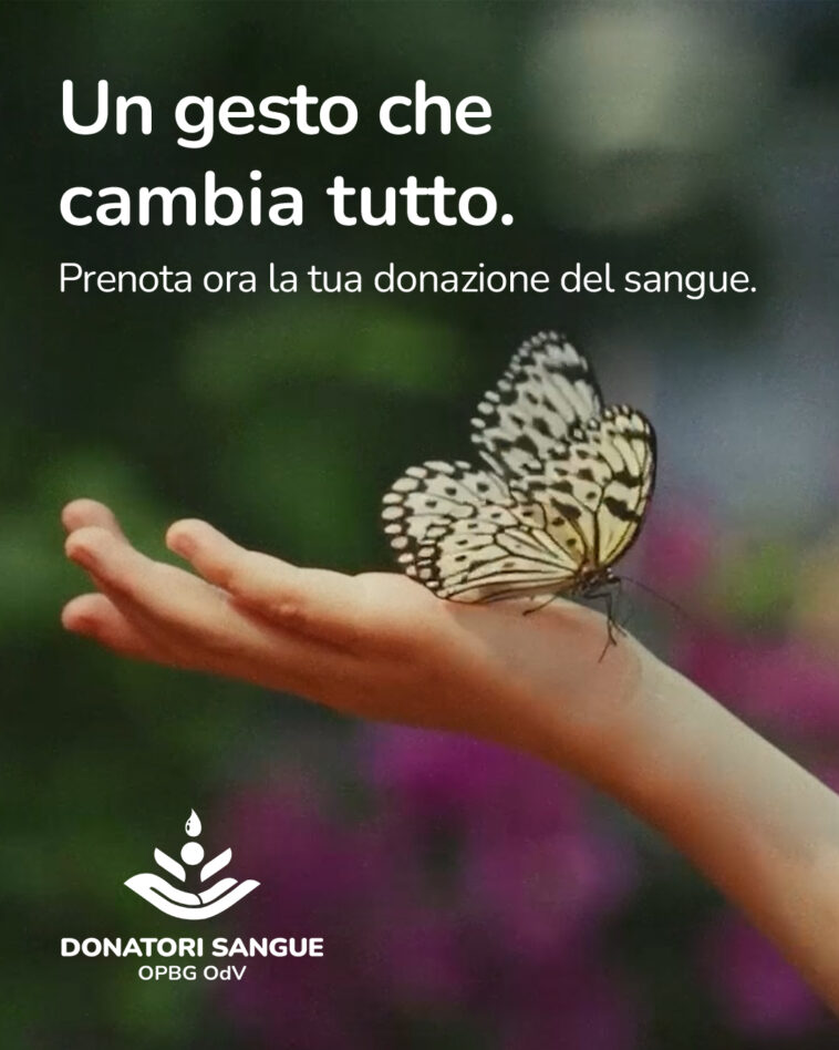 In estate, quando le città si svuotano, anche i centri di raccolta sangue registrano un calo. Per questo motivo l’associazione Donatori Sangue Ospedale Pediatrico Bambino Gesù O.d.V. ha lanciato la campagna “Effetto Farfalla”, con lo slogan “Un gesto che cambia tutto”. L’obiettivo è sensibilizzare sulla donazione di sangue, in un periodo in cui la richiesta resta alta, soprattutto per i bambini che necessitano di interventi urgenti, terapie salvavita e trasfusioni quotidiane.