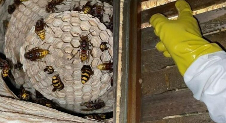 Il calabrone europeo, noto anche come Vespa crabro, è il più grande imenottero europeo. Può arrivare a 4 centimetri di lunghezza, ha colori accesi con ali rosse e righe gialle e marroni sull’addome. Non è aggressivo se non disturbato, ma la vicinanza a spazi abitati può creare timore, soprattutto con bambini piccoli nelle vicinanze. Il nido si trovava dietro alcune tavole di legno del sottotetto e ospitava una piccola colonia.
