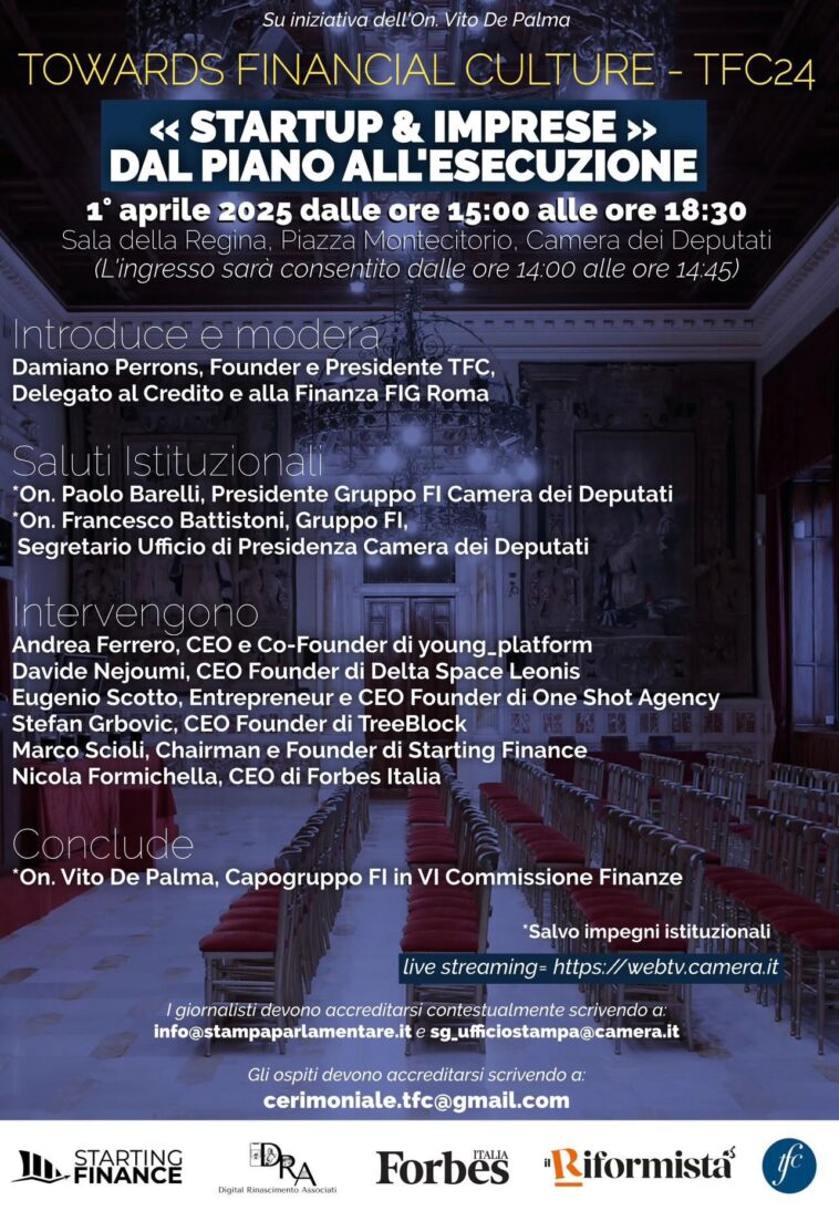 Il prossimo 1° aprile, la Sala della Regina di Piazza Montecitorio, nella sede della Camera dei Deputati di Roma, ospiterà un evento di grande rilevanza per l’imprenditoria e le startup italiane. L’incontro, dal titolo “Startup & Imprese: Dal Piano all’Esecuzione”, si terrà dalle 15:00 alle 18:30 ed è organizzato su iniziativa dell’Onorevole Vito De Palma. La conferenza si concentrerà sull’importanza di trasformare le idee in realtà concrete, affrontando le sfide e le opportunità che le imprese emergenti devono affrontare durante il loro percorso di crescita.