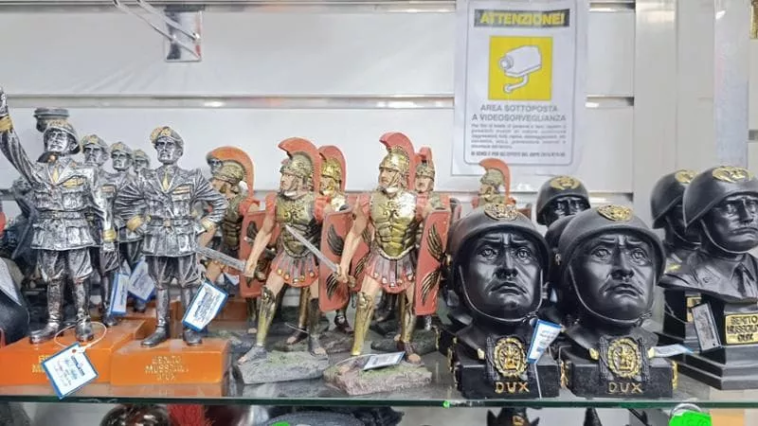 A pochi passi dalla stazione Termini, tra calamite turistiche e oggetti di chincaglieria, un negozio in via delle Terme di Diocleziano 31 espone e vende statuette di Benito Mussolini. Tra i pezzi più richiesti ci sono il modellino del Duce con le mani sui fianchi a 20 euro e la scultura da 20 centimetri che esegue il saluto romano al costo di 25 euro. Il titolare gestisce anche un altro negozio in via Nazionale e conferma che i clienti più interessati a questi articoli sono turisti tedeschi, francesi e alcuni italiani. Non teme eventuali accuse di apologia di fascismo e afferma che la richiesta di questi cimeli resta alta, nonostante occasionali proteste da parte dei passanti.